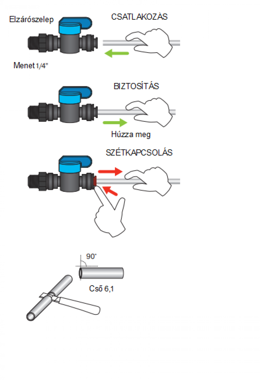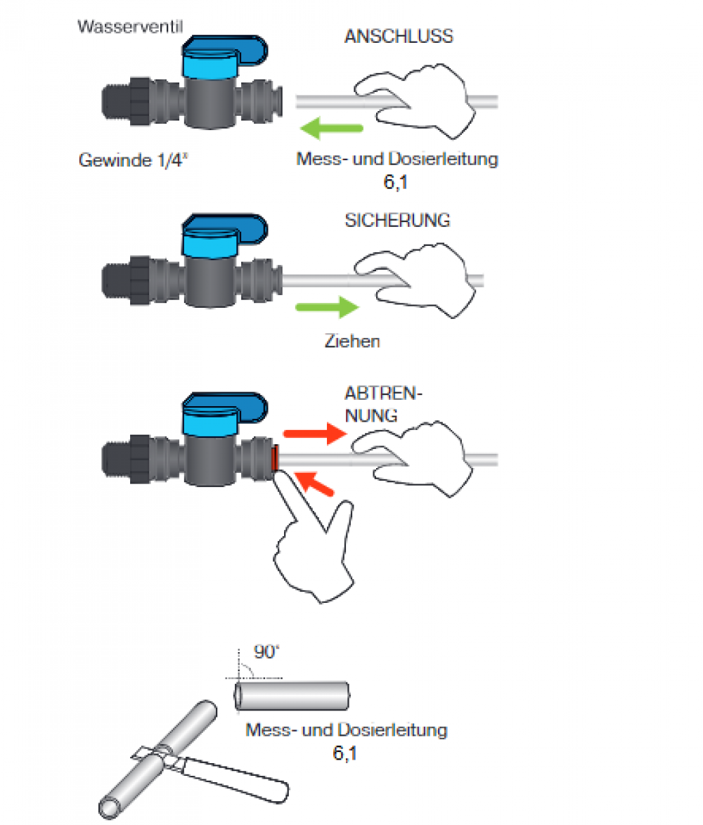 Collegamento dell`acqua misurataL`acqua della piscina destinata alla misurazione deve essere collegata ad ASIN AQUA. Collegare l`alimentazione idrica misurata dopo la pompa, prefiltro. Inseriamo la valvola di intercettazione nel connettore G 1/4". Per collegare l`acqua dosata al tuo ASIN AQUA, Aseko fornisce un raccordo di collegamento Speedfit unico. Per collegare, spingere il tubo di collegamento nel connettore Speedfit, quindi tirare il tubo Per scollegare, tenere premuto il morsetto ad anello ed estrarre il tubo di collegamento. ATTENZIONE: utilizzare un coltello affilato per trattare le estremità dei tubi. ATTENZIONE: serrare solo a mano. Non utilizzare pinze o altri strumenti.