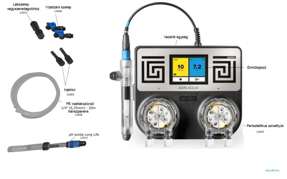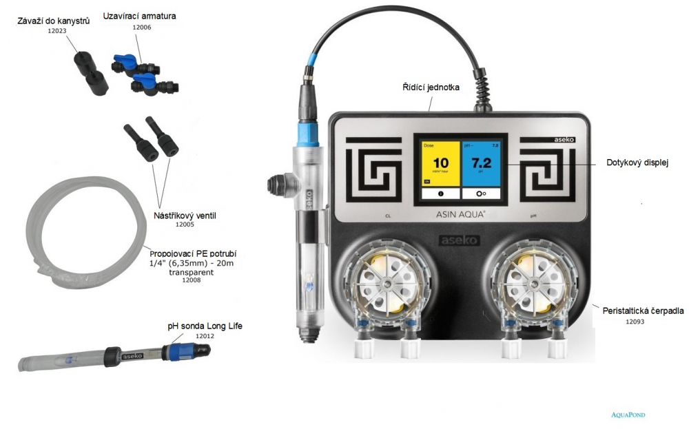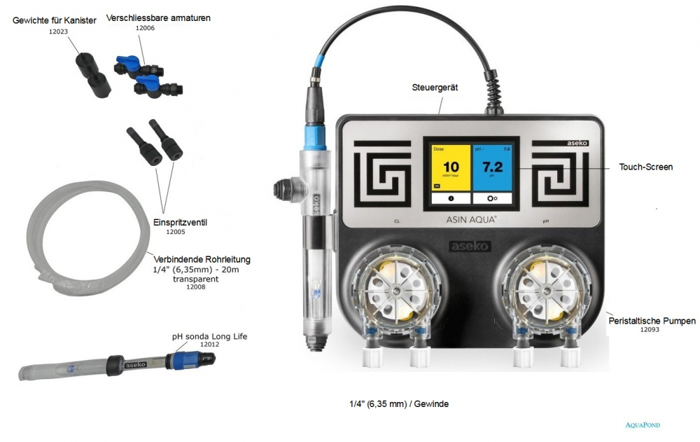 Asin Aqua DOSE con sensore di flusso è un dispositivo compatto per piscine fino a 250 m 3 che si prende cura dell`acqua della piscina. Eroga una quantità preimpostata di disinfezione a intervalli di tempo impostati dall`utente. Mantiene il valore pH selezionato. Grazie a questo l`acqua è sempre limpida e impeccabile. Il valore impostato e il pH misurato vengono visualizzati su un ampio display touch, sul quale vengono impostati anche tutti i parametri necessari in una semplice modalità di dialogo. Contiene una sonda per la misurazione del pH, una pompa dosatrice e un flussometro di controllo. DOSE - dosaggio temporale della disinfezione (dose oraria di disinfezione).