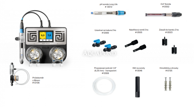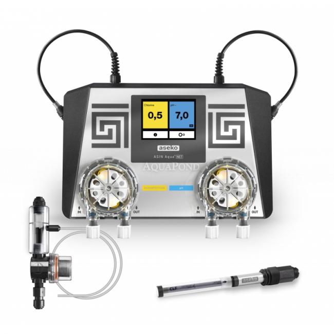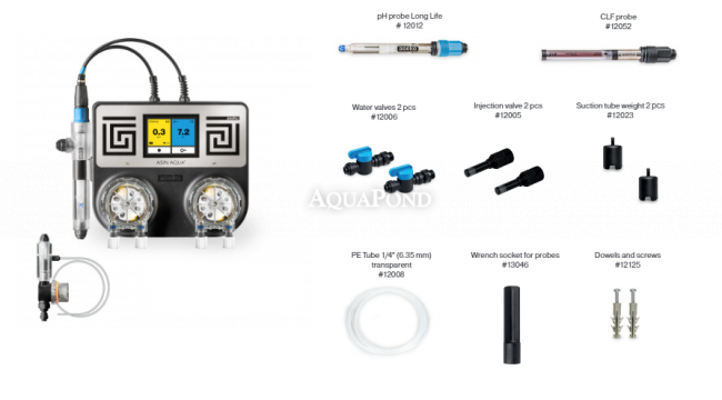 Asin Aqua CLF forma un`unità compatta composta da un`unità di controllo, elettrodi per la misurazione di pH e CLF e due pompe dosatrici con una capacità di 60 ml/min. I valori di pH e cloro vengono visualizzati sul touch screen integrato.