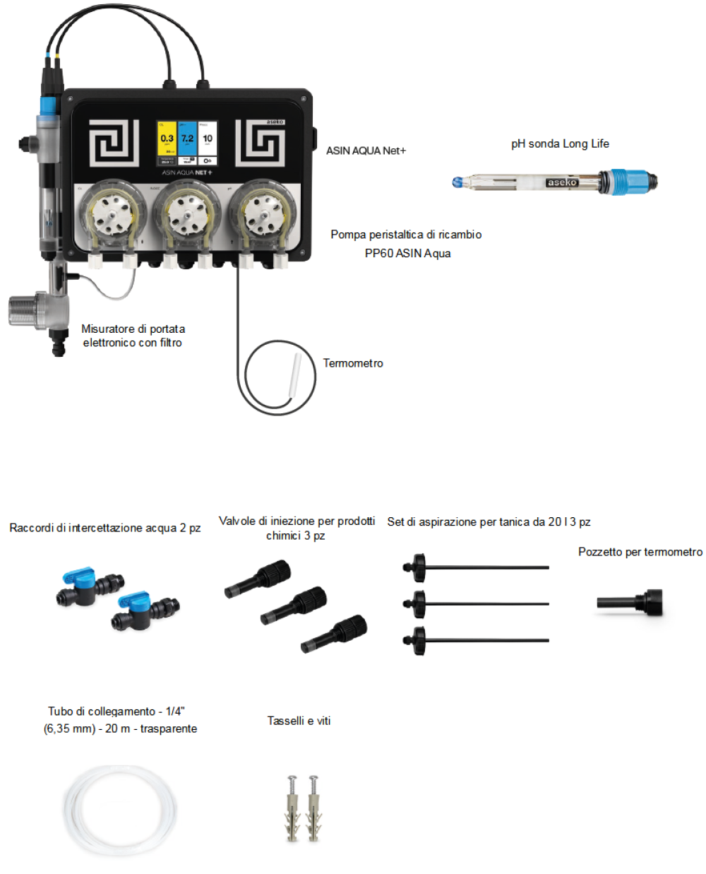 Stazione di dosaggio Aseko Asin Aqua Net+ Dose è una macchina dosatrice progettata per il trattamento efficace e affidabile dell`acqua di piscina in piscine private, adatta all`uso in piscine e vasche idromassaggio con un volume fino a 250 m3. È dotata di una sonda pH per la regolazione automatica del pH e consente il dosaggio del cloro temporizzato. Offre una pompa aggiuntiva per il dosaggio della preparazione FLOC+C e funzioni di gestione della tecnologia di base per piscine che coprono completamente le esigenze quotidiane delle piscine domestiche. Dispone di un connettore LAN installato per la connessione a Internet. Utilizzando l`applicazione iPool LIVE sul tuo cellulare, puoi controllare tutti i valori di qualità dell`acqua della piscina impostati e gli eventi associati al funzionamento della piscina e al dosaggio dei prodotti chimici.