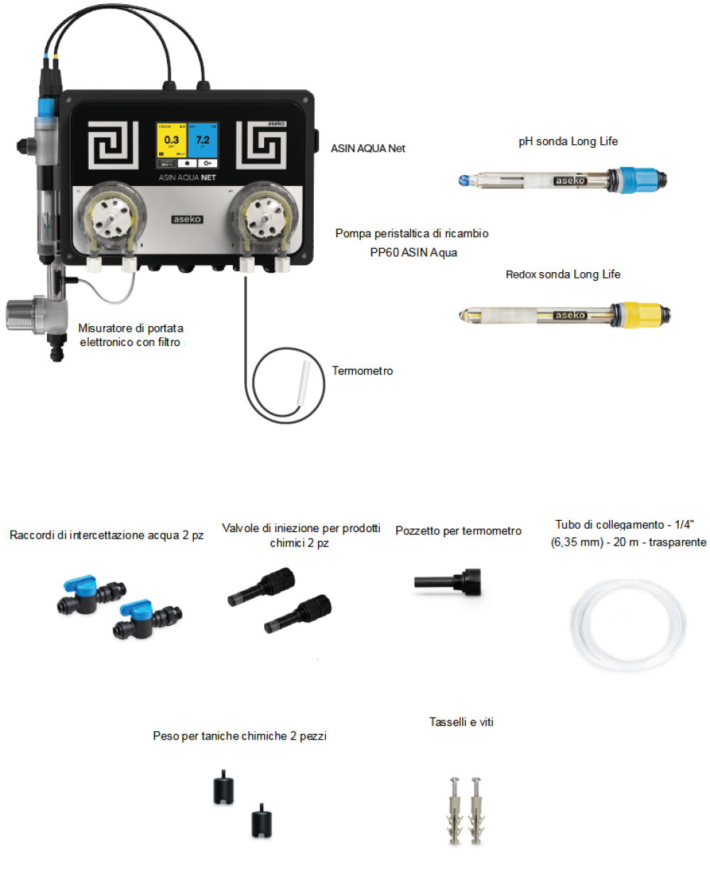 La stazione di dosaggio Asin Aqua Net Redox Aseko è un dispositivo automatico per il dosaggio di prodotti chimici per il trattamento dell`acqua in piscine private, adatto all`uso in piscine e vasche idromassaggio con un volume fino a 250 m3. È dotato di una sonda Redox Long Life per la misurazione del potenziale di ossido-riduzione (ORP) e di una sonda pH per la regolazione automatica del pH. Dispone di un connettore LAN integrato per la connessione a Internet. Utilizzando l`applicazione iPool LIVE sul tuo cellulare, puoi controllare tutti i valori di qualità dell`acqua della piscina impostati e gli eventi associati al funzionamento della piscina e al dosaggio dei prodotti chimici.