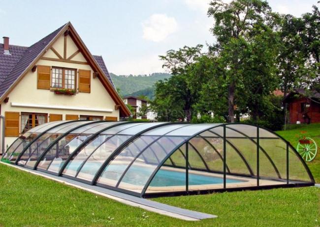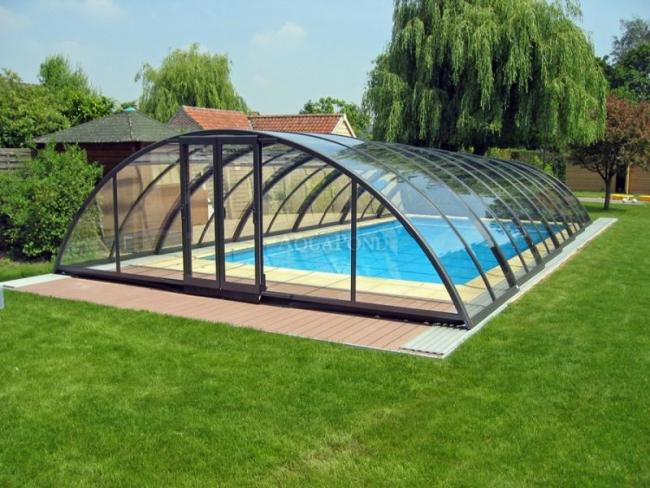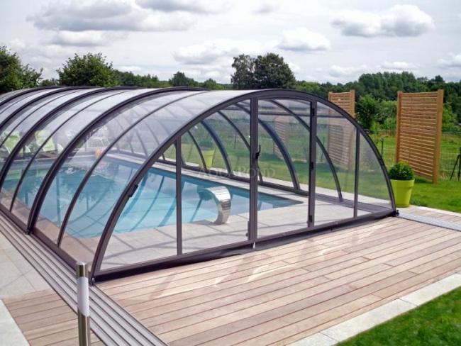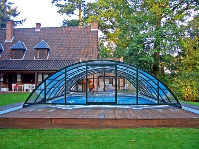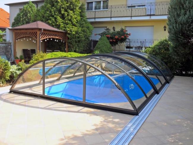 Questa copertura per piscina è particolarmente adatta per giardini frammentati con alberi e arbusti. Nei modelli di copertura Universe più ampi, l`altezza centrale più alta consente il libero movimento davanti e dietro la parete più corta della piscina. Le porte scorrevoli laterali possono essere posizionate anche nelle pareti laterali dei segmenti più alti e più bassi.
