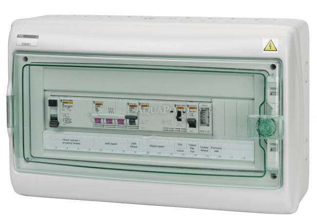 Il dispositivo include un protettore di corrente 30 mA, interruttore - autom. / Modalità di funzionamento filtraggio manuale, orologio di commutazione, protezione filtrazione 3f, protezione luci piscina, protezione alimentazione controcorrente, termostato elettronico digitale con indicatore luminoso incluso sensore di temperatura, protezione pompa di circolazione e commutazione o el. valvola o caldaia a gas. Impostazione della temperatura desiderata dell`acqua della piscina direttamente nel centralino.