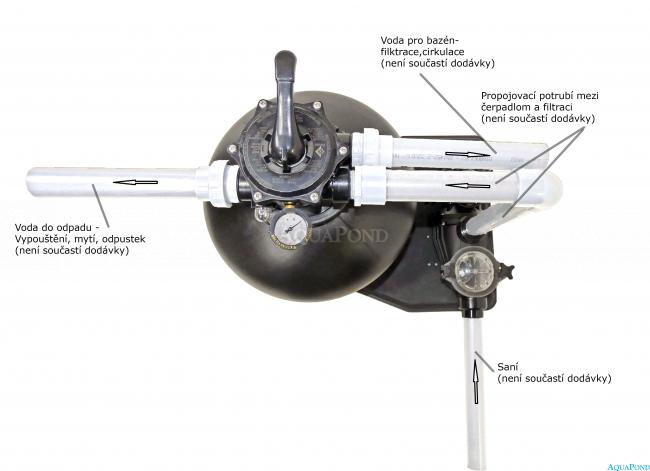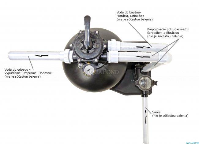 I filtri a sabbia funzionano secondo il principio naturale della filtrazione dell`acqua. L`acqua passa attraverso lo strato di sabbia depositato, che cattura le piccole impurità. In questo modo, ovviamente, la sabbia si intasa ed è necessario lavarla, a cui serve la valvola a sei vie. Ruotando la valvola nella posizione di lavaggio della sabbia, cambiamo la direzione del flusso d`acqua e quindi scarichiamo lo sporco sedimentato nei rifiuti. Possiamo ripetere questo processo per tutta la vita della sabbia, che è molto lunga rispetto ad altri metodi di filtrazione.
