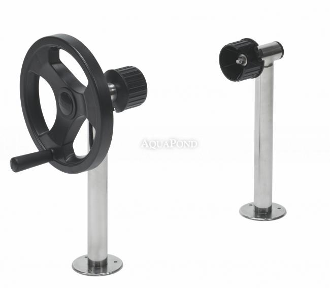 Parte del dispositivo di avvolgimento per una facile movimentazione della copertura solare per piscina. Cavalletto con attacco fisso senza asta telescopica di recupero e kit per l`aggancio della vela solare.