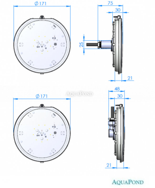 Lampada con LED LumiPlus Flexi RGB a luce colorata. È compatibile con tutti i sistemi di controllo disponibili per i proiettori LED AstralPool. Le lampade vengono fornite con un cavo staccabile lungo 2,5 m, il trasformatore non è incluso nella consegna. Utilizzare solo nel sistema LumiPlus Flexi. Dimensioni esterne Ø 171 x 48 mm.