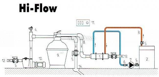 Lo scambiatore di calore Hi-Flow è appositamente progettato per il riscaldamento dell`acqua di piscine o vasche idromassaggio. Il più vantaggioso è l`utilizzo di questo scambiatore interamente in acciaio inox quando si riscalda l`acqua con una caldaia a gas o di altro tipo, o con collettori solari. Si consiglia di aggiungere ad ogni scambiatore utilizzato un adeguato controllo automatico che garantisca in modo affidabile la sicurezza e il comfort dell`operatore.