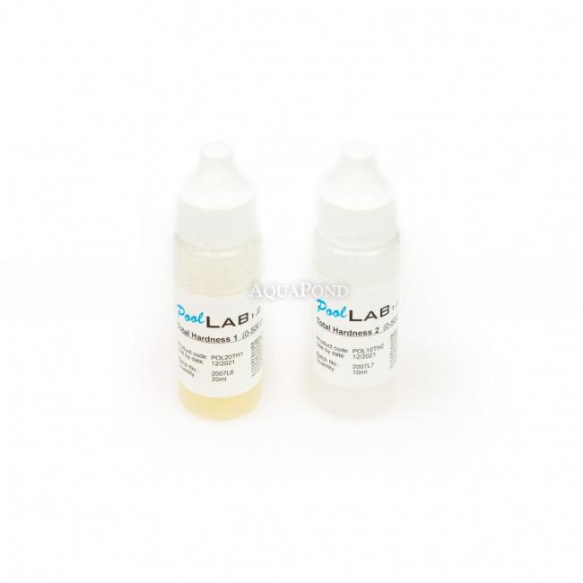 I reagenti per la durezza totale (intervallo 0-500 ppm) sono forniti in un sistema a due confezioni: Durezza totale 1 (20 ml) e Durezza totale 2 (10 ml)