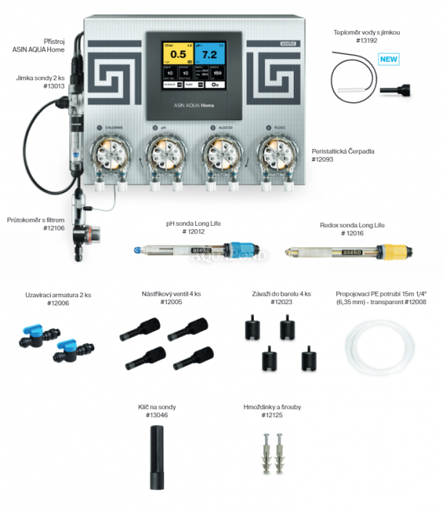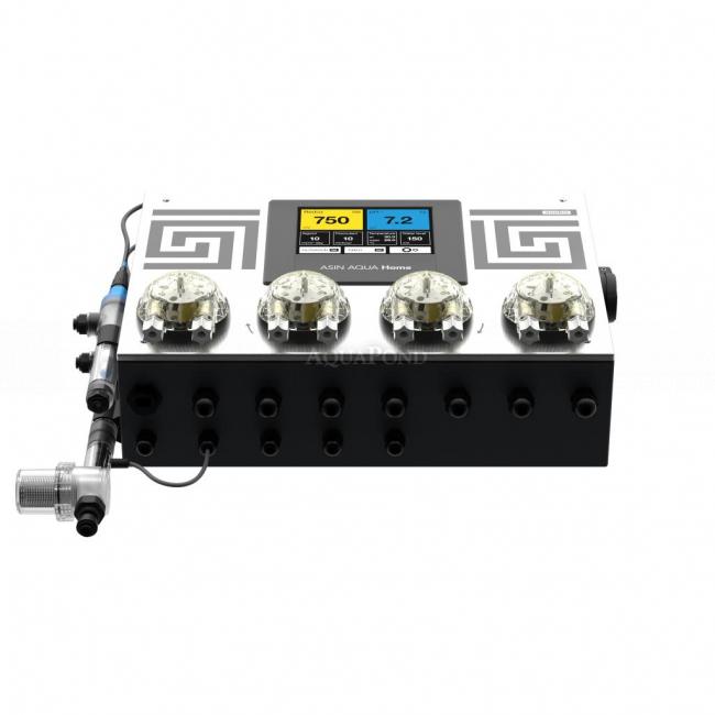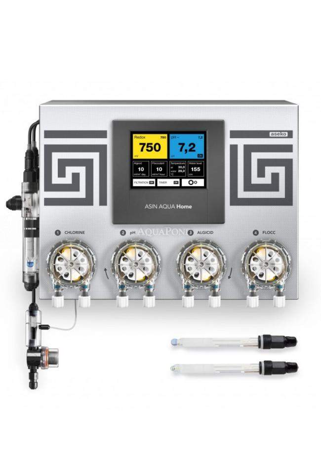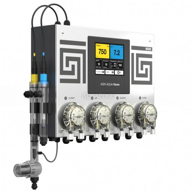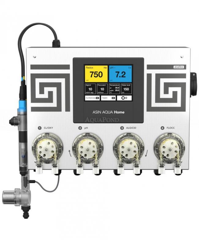 Forma un`unità compatta composta da un`unità di controllo, un elettrodo per la misurazione di pH, redox e quattro pompe dosatrici con una capacità di 60 ml/min. I valori dello stato chimico vengono visualizzati sul touch screen integrato. Le automazioni Asin Home sono inoltre dotate di serie di un relè ausiliario per il collegamento della filtrazione della piscina con un ingresso fino a 1kW e di un sensore di temperatura per il controllo e la visualizzazione della temperatura dell`acqua nella piscina.