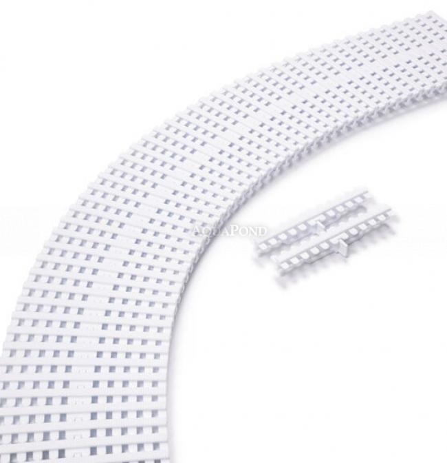 Griglia per canale di sfioro, adatta a piscine di forme atipiche. Sono conformi alla norma EN 13451-1 (8 mm). Per ogni metro di lunghezza sono necessari 45 segmenti di questa griglia.