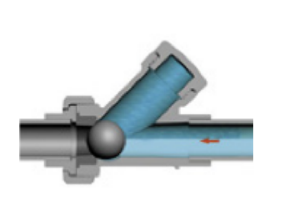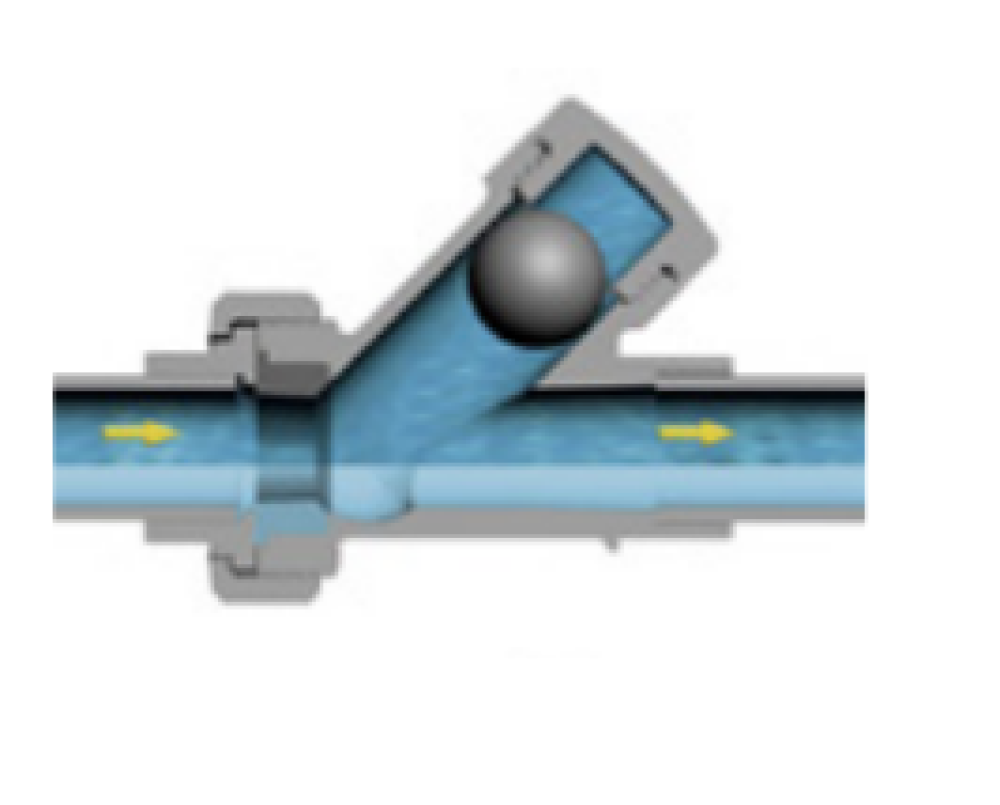 Valvola aperta: l`acqua solleva la sfera nella giusta direzione mentre scorre liberamente.