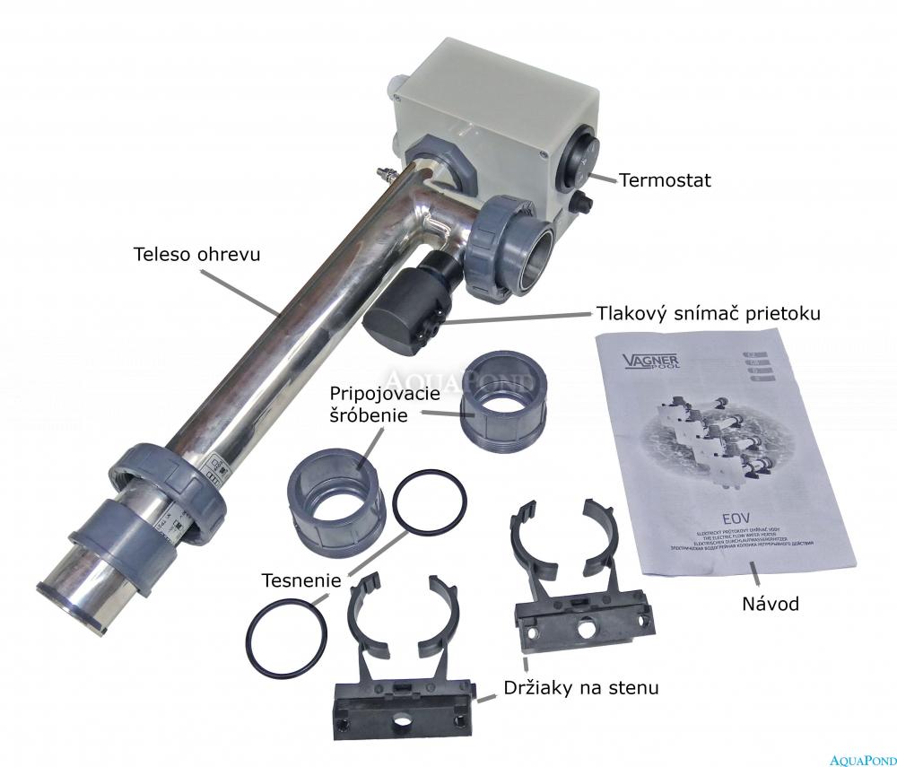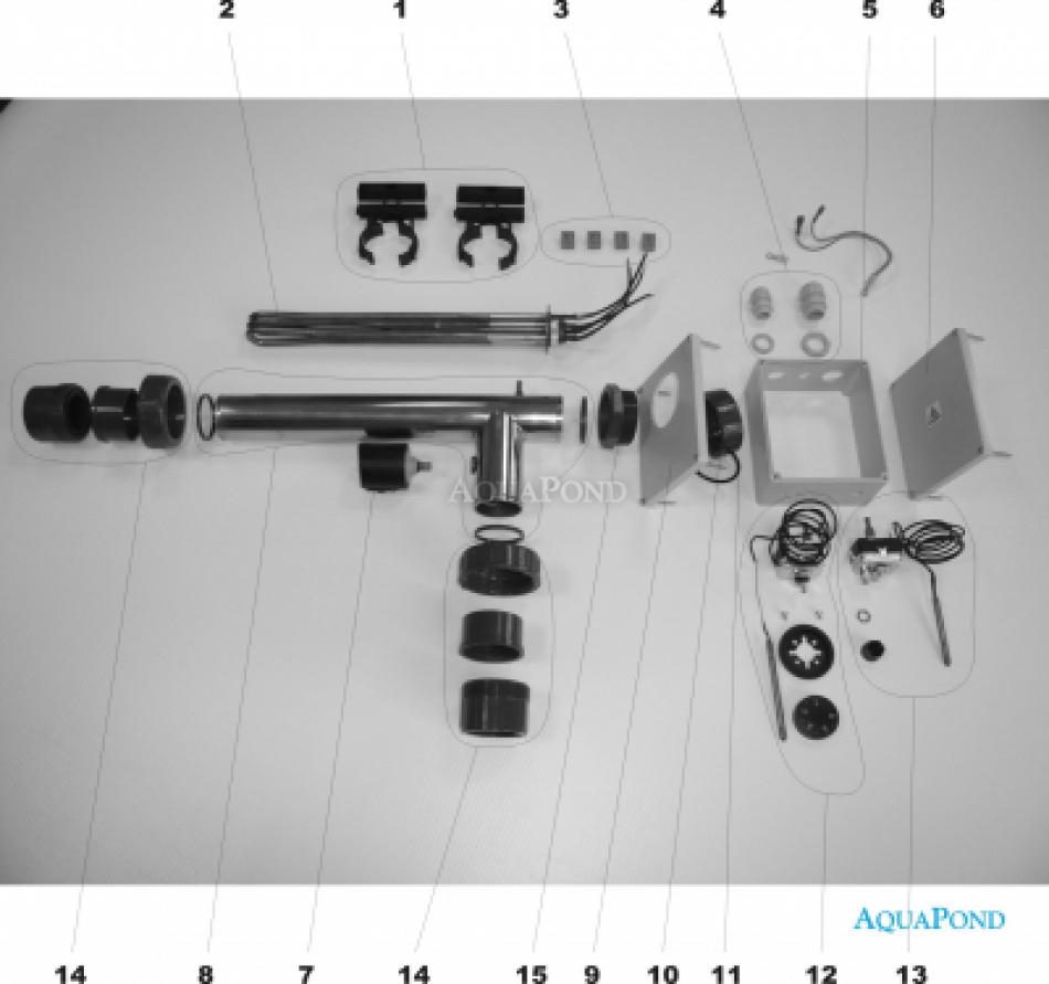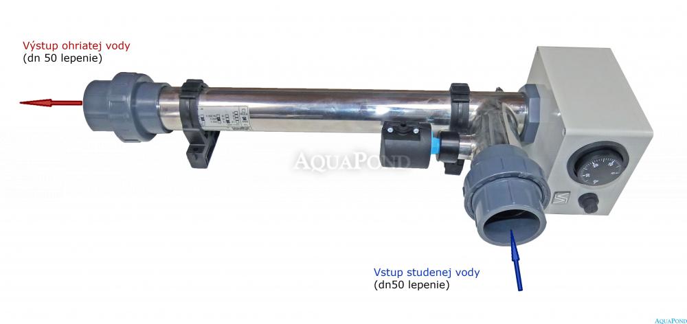 Lo scaldacqua elettrico è destinato al riscaldamento dell`acqua nelle piscine e nelle vasche idromassaggio. Il funzionamento consiste nel riscaldare l`acqua in flusso tramite l`elemento riscaldante, la temperatura dell`acqua riscaldata viene impostata dal termostato di regolazione. L`elemento riscaldante viene commutato da un contattore, il quale è controllato dal suddetto termostato, indicatore di flusso di sicurezza. Per questo motivo, il cosiddetto Grande automazione: programmatore di filtraggio 24 ore su 24, limitatore di sovratensione (protezione contro tensioni di contatto pericolose), protezione termica del motore, contattore e interruttore di riscaldamento.