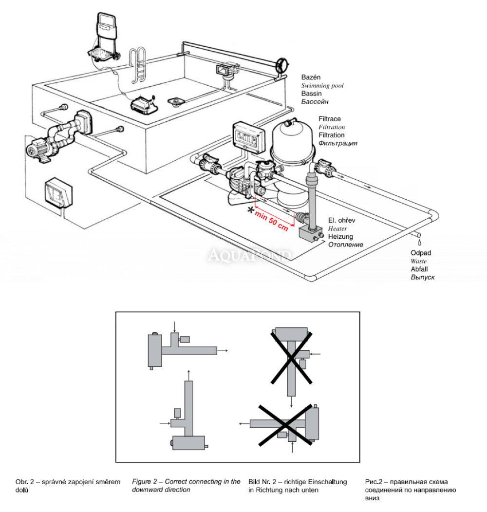 Lo scaldacqua elettrico è destinato al riscaldamento dell`acqua nelle piscine e nelle vasche idromassaggio. Il funzionamento consiste nel riscaldare l`acqua in flusso tramite l`elemento riscaldante, la temperatura dell`acqua riscaldata viene impostata dal termostato di regolazione. L`elemento riscaldante viene commutato da un contattore, il quale è controllato dal suddetto termostato, indicatore di flusso di sicurezza. Per questo motivo, il cosiddetto Grande automazione: programmatore di filtraggio 24 ore su 24, limitatore di sovratensione (protezione contro tensioni di contatto pericolose), protezione termica del motore, contattore e interruttore di riscaldamento.